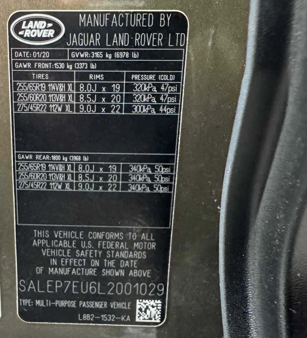 2020 Land Rover Defender 110 SE 4WD 8-Speed Automatic 3.0L I6 Bluetooth, Rear Backup Camera, Service Records Available, Free Carfax, REAR BACK UP CAMERA, BLUETOOTH HANDS FREE WIRELESS, POWER SEATS, LEATHER SEATS, NON SMOKER, LOCAL TRADE, SERVICE RECORDS AVAILABLE, CLEAN CARFAX NO ACCIDENTS REPORTED, ORIGINAL MSRP OF $72,780, Defender 110 SE, 4D Sport Utility, 3.0L I6, 8-Speed Automatic, 4WD, Ebony Leather, 12-Way Heated Electric Memory Seats, Adaptive Cruise Control, Advanced Off-Road Capability Package, Advanced Tow Assist, Auto tilt-away steering wheel, Auto-dimming door mirrors, Black Contrast Roof, Black Pack, Compass, Driver Assist Pack, Driver door bin, Garage door transmitter: HomeLink, Gloss Black Grille Bar, Heated door mirrors, Navigation system: Connected Navigation PIVI Pro, Opening Panoramic Sunroof, Towing Pack, Trailer Hitch w/Electrical Connector, Wheels: 19" Gloss Black Style 6010.